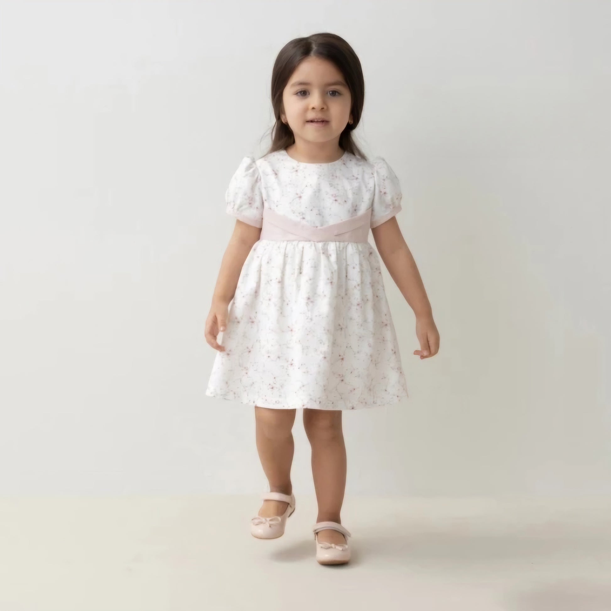 Questo vestito per neonati in raso rosa chiaro e bianco presenta un motivo floreale da sogno, morbide maniche arricciate e una vita delicatamente arricciata per una perfetta silhouette da principessa. La fodera in cotone assicura comfort, rendendolo perfetto per le date di gioco o i momenti speciali, mantenendo il bambino asciutto e comodo. L'elegante design presenta un corpetto arricciato per una vestibilità aderente, mentre le maniche arricciate aggiungono un tocco di tenerezza in più. Per garantire un bel volume alla gonna è stata aggiunta una sottogonna in tulle. L'effetto principessa è garantito.