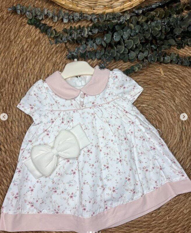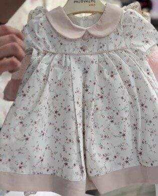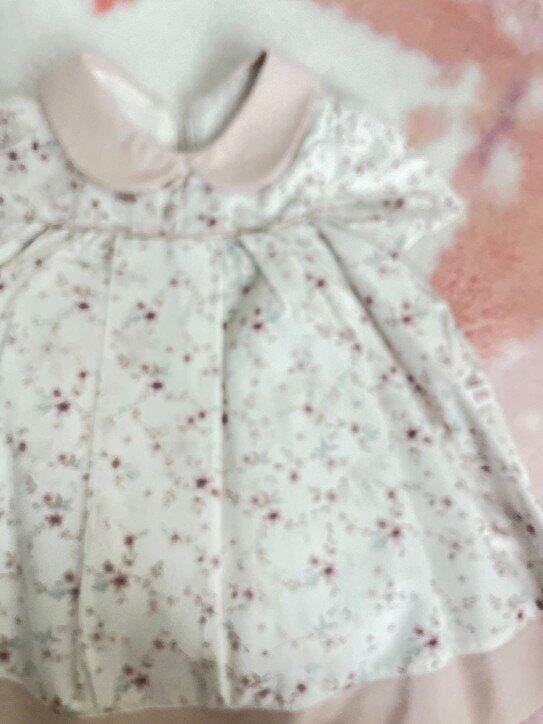 Details that spark happiness: that precious rounded Peter Pan collar in soft blush pink, delicate scattered florals that dance across pure cotton, and the sweetest contrasting hem trim that adds just the right touch of sophistication – because even Tuesdays deserves a little magic.